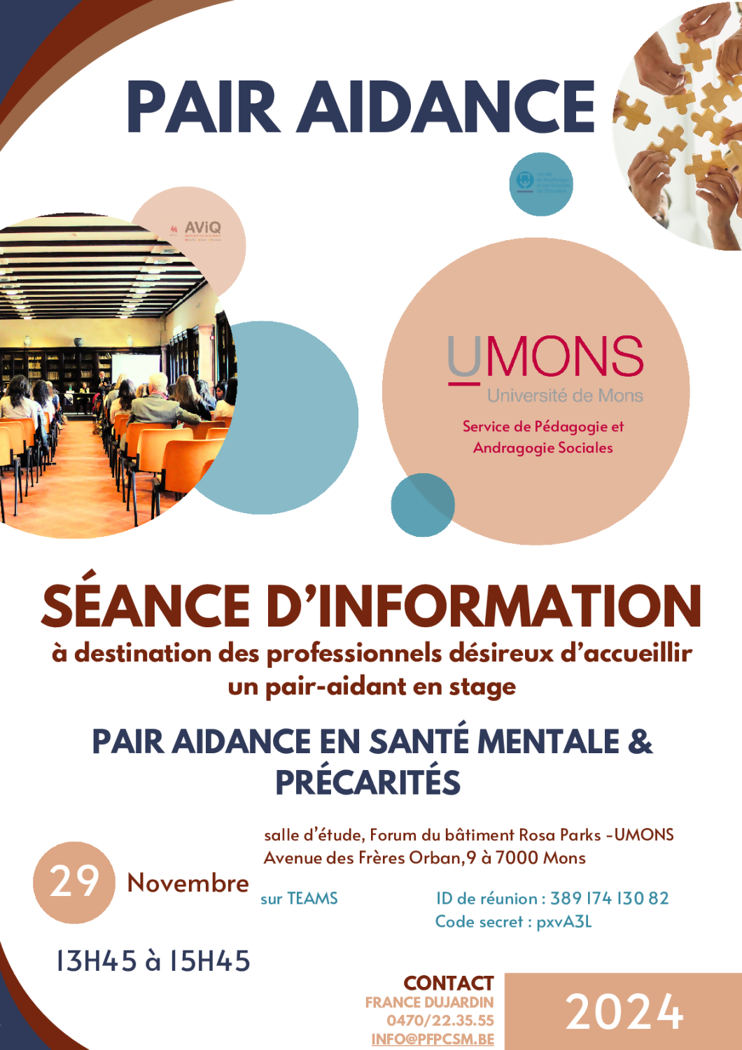 Séance d'information à destination des professionnels désireux d'accueillir un pair-aidant en stage, organisée le 29 novembre de 13h45 à 15h45 à l'UMons (salle d'étude, forum du bâtiment Rosa Parks (Avenue des Frères Orban 9, 7000 MONS) ou sur Teams (pour plus d'informations, cliquez sur le visuel d'invitation)).