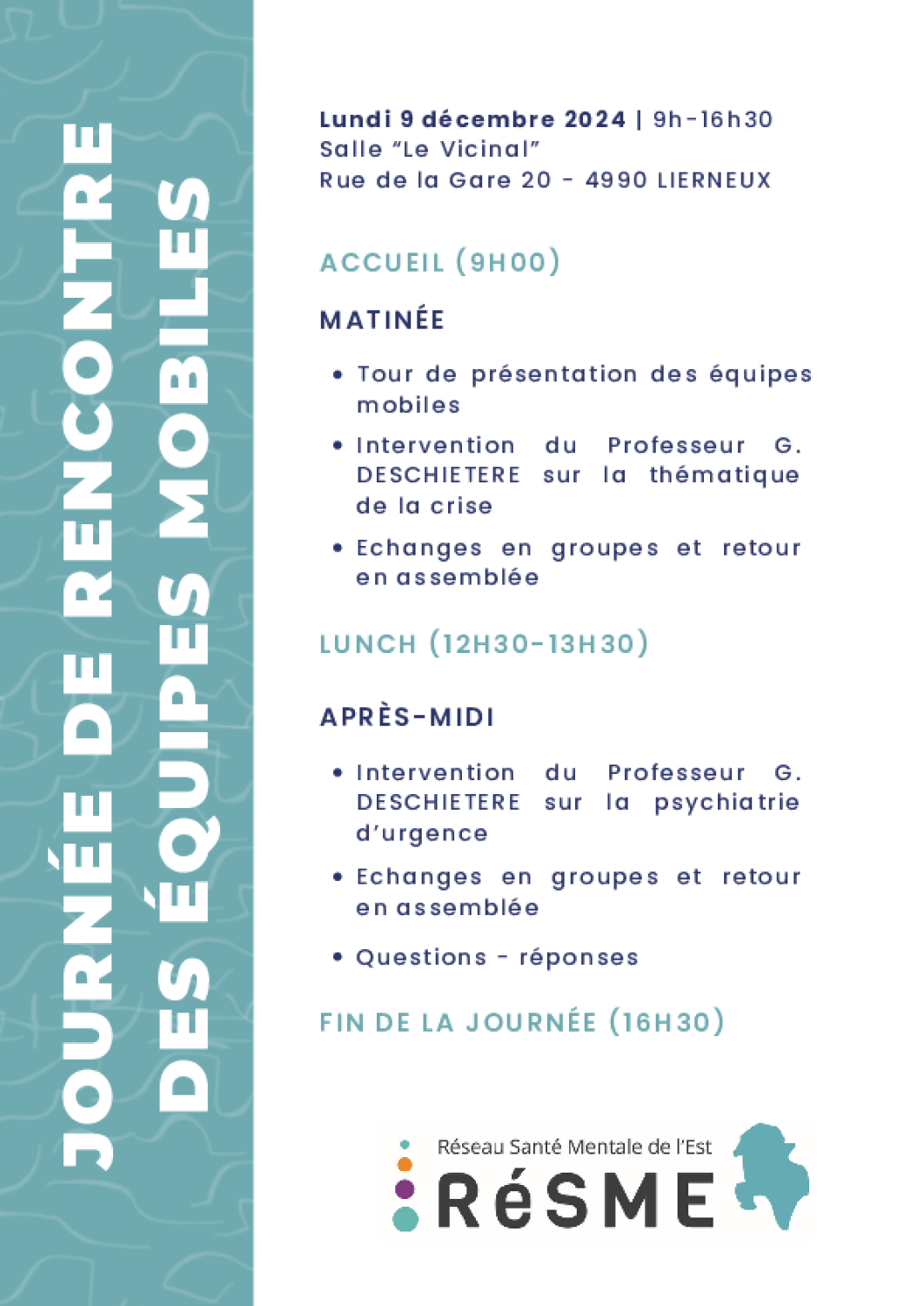Cette journée aura pour thématique, en avant-midi, la question de la crise et, en après-midi, le projet psychiatrie d’urgence. Elle sera l'occasion pour les différentes équipes mobiles de se rencontrer, de partager leurs réalités et leurs défis quotidiens, mais également de réseauter.