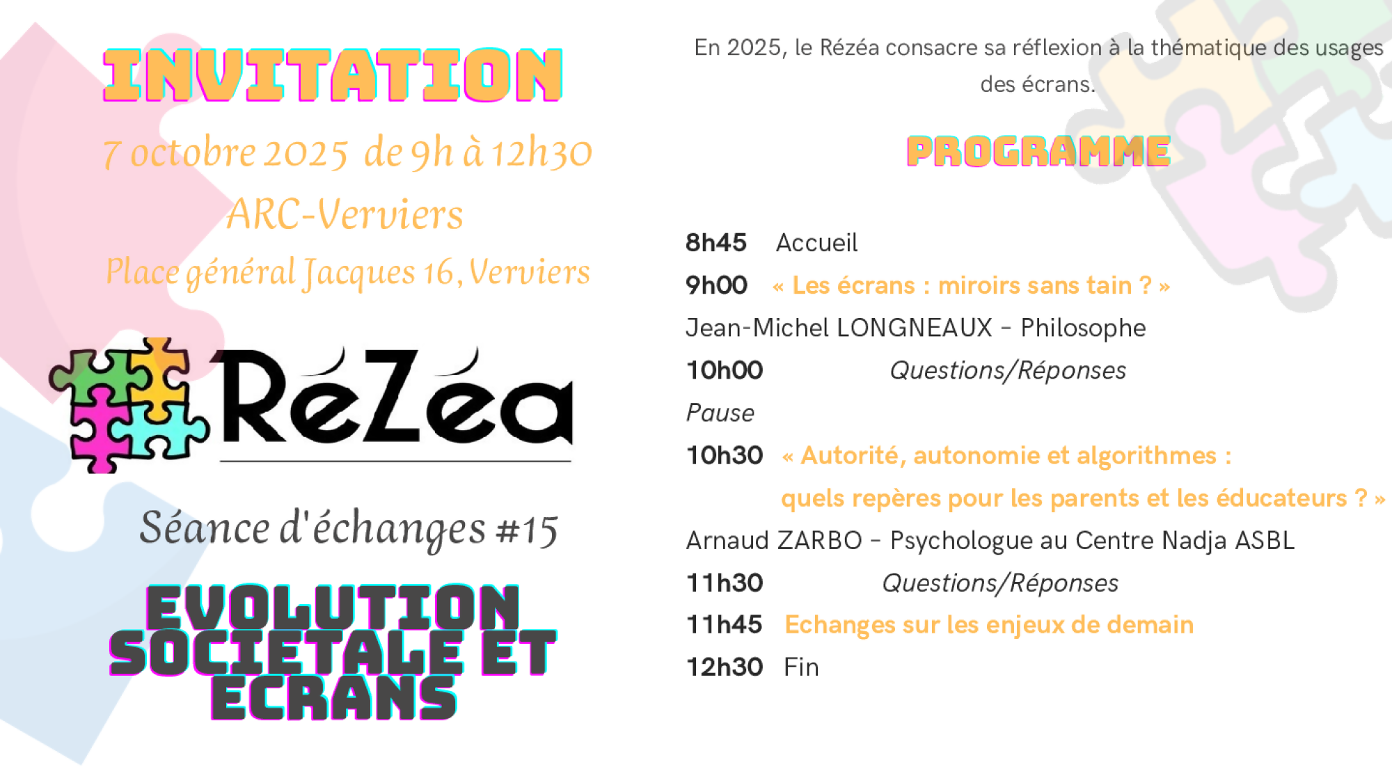 En 2025, le RéZéa consacre sa réflexion à la thématique des usages des écrans. C'est dans ce cadre qu'il vous convie à sa séance d'échanges n°15 sur "l'évolution sociétale et les écrans", qui aura lieu le mardi 7 octobre 2025 de 9h à 12h30 à la salle de l'ARC de Verviers.