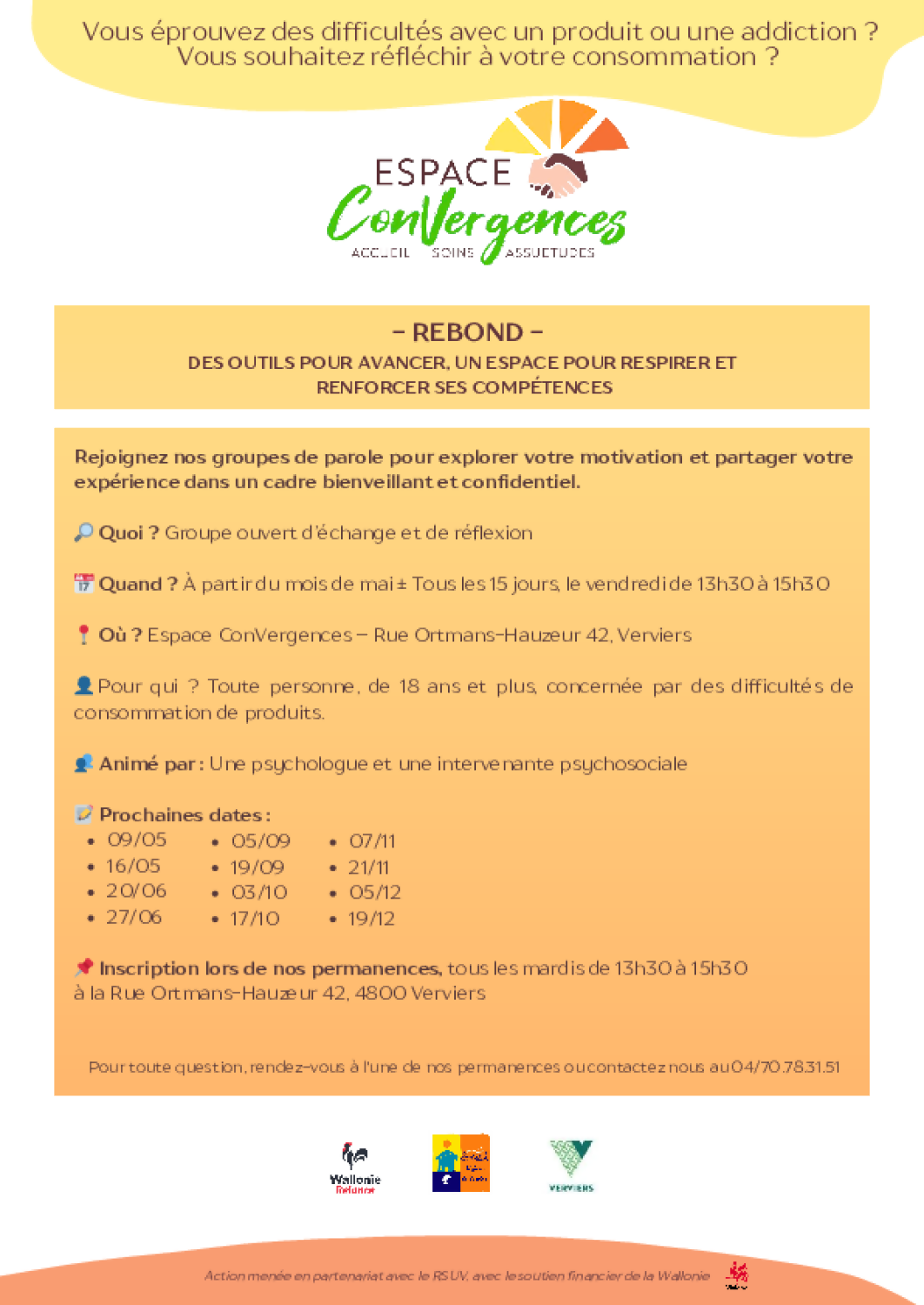 Le groupe REBOND débute au mois de mai et vous propose un espace pour faire le point, partager et avancer, pas à pas.