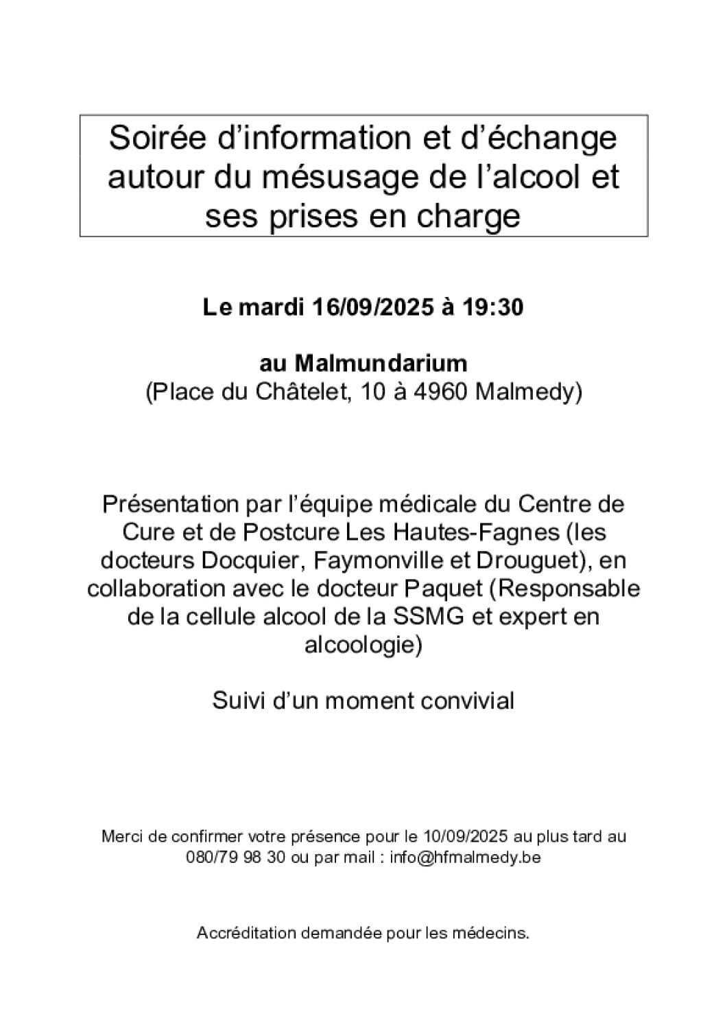 Présentation par l'équipe médicale du Centre de Cure et de Postcure Les Hautes-Fagnes (les docteurs Docquier, Faymonville et Drouguet), en collaboration avec le Dr Paquet (responsable de la cellule alcool de la SSMG et expert en alcoologie).