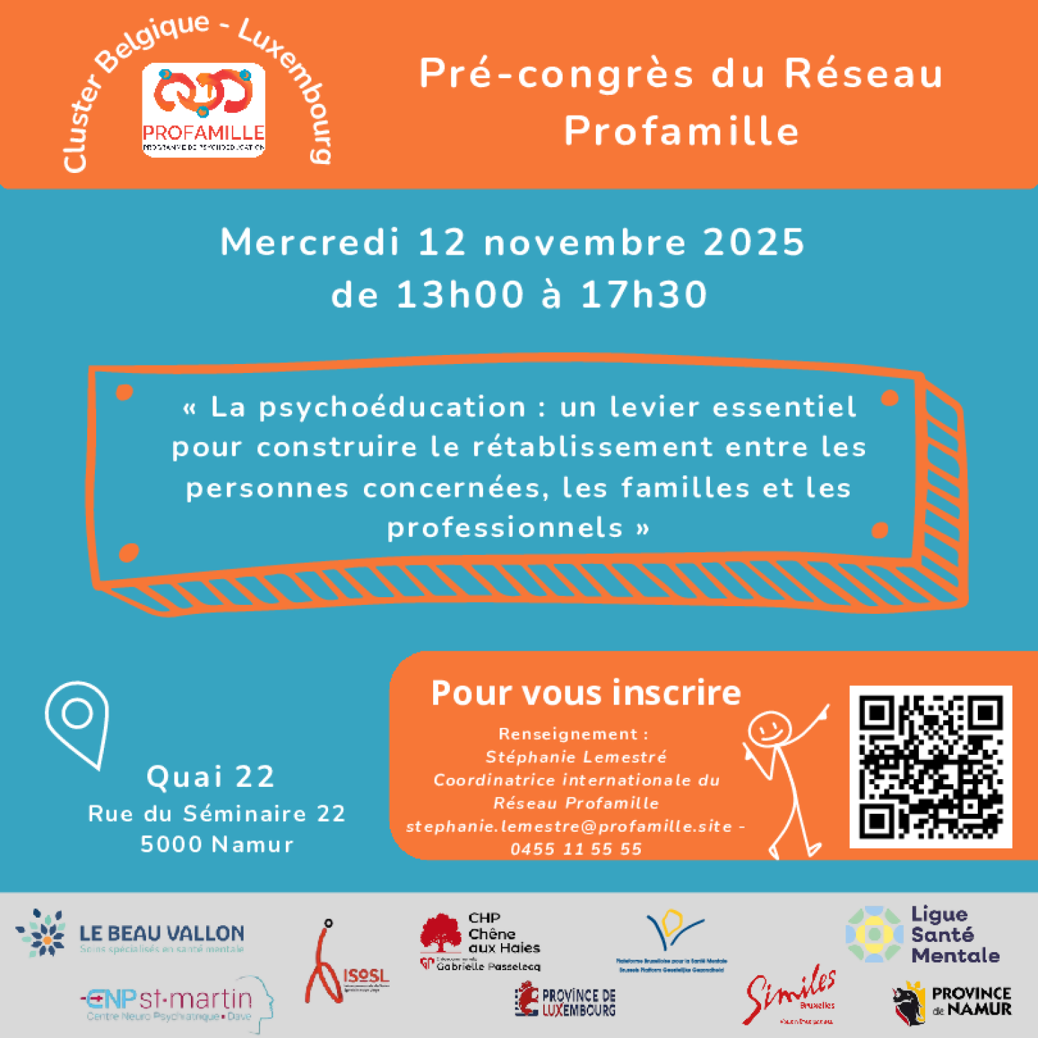 Le mercredi 12 novembre prochain aura lieu à Namur le prochain pré-congrès du Réseau Profamille sur la thématique suivante "La psychoéducation : un levier essentiel pour construire le rétablissement entre les personnes concernées, les familles et les professionnels."