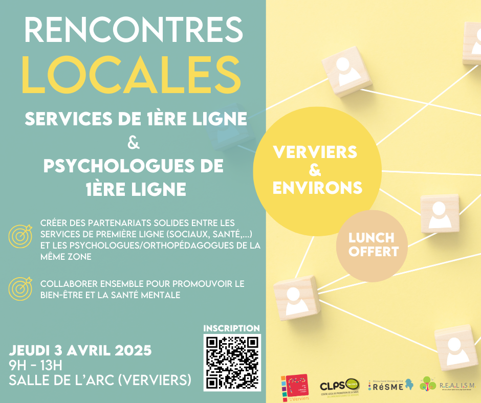 Le jeudi 3 avril prochain, entre 9h et 13h, est organisée une "rencontre locale" entre les services de première ligne et les psychologues de 1ère ligne actifs sur Verviers et ses environs.