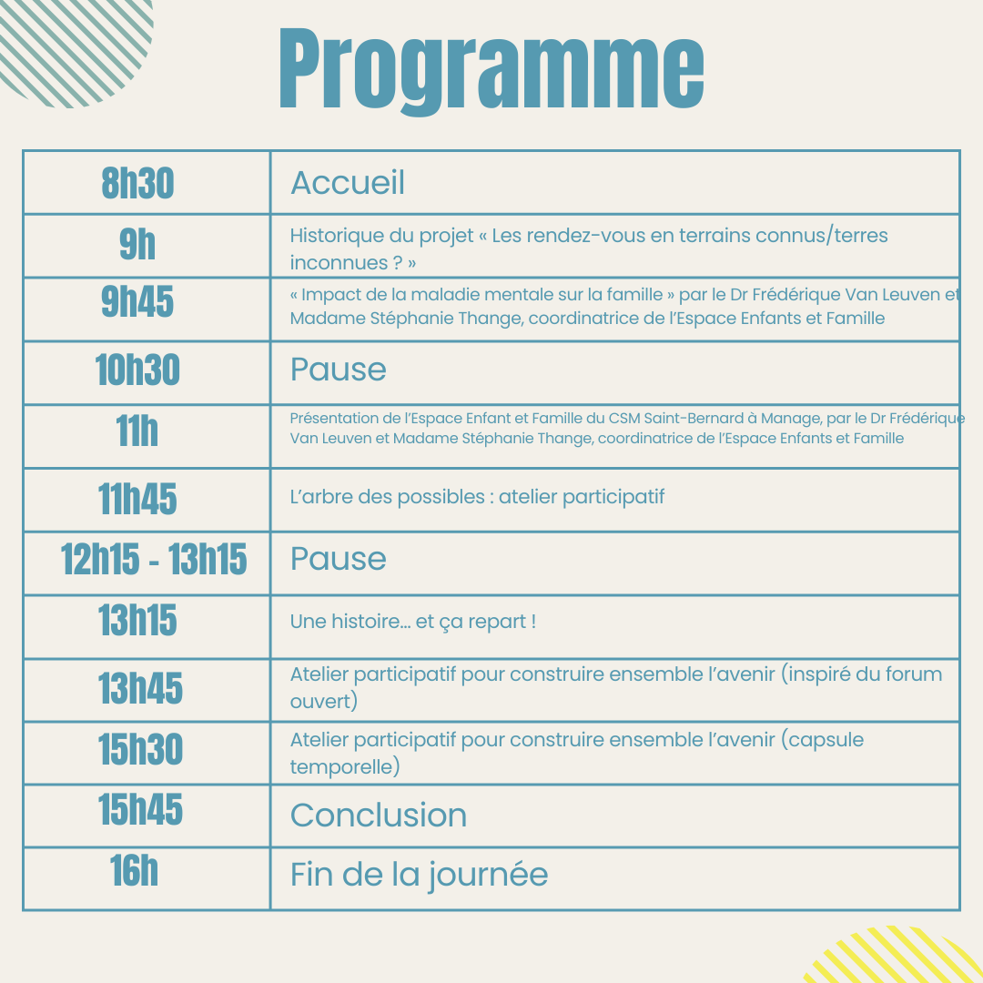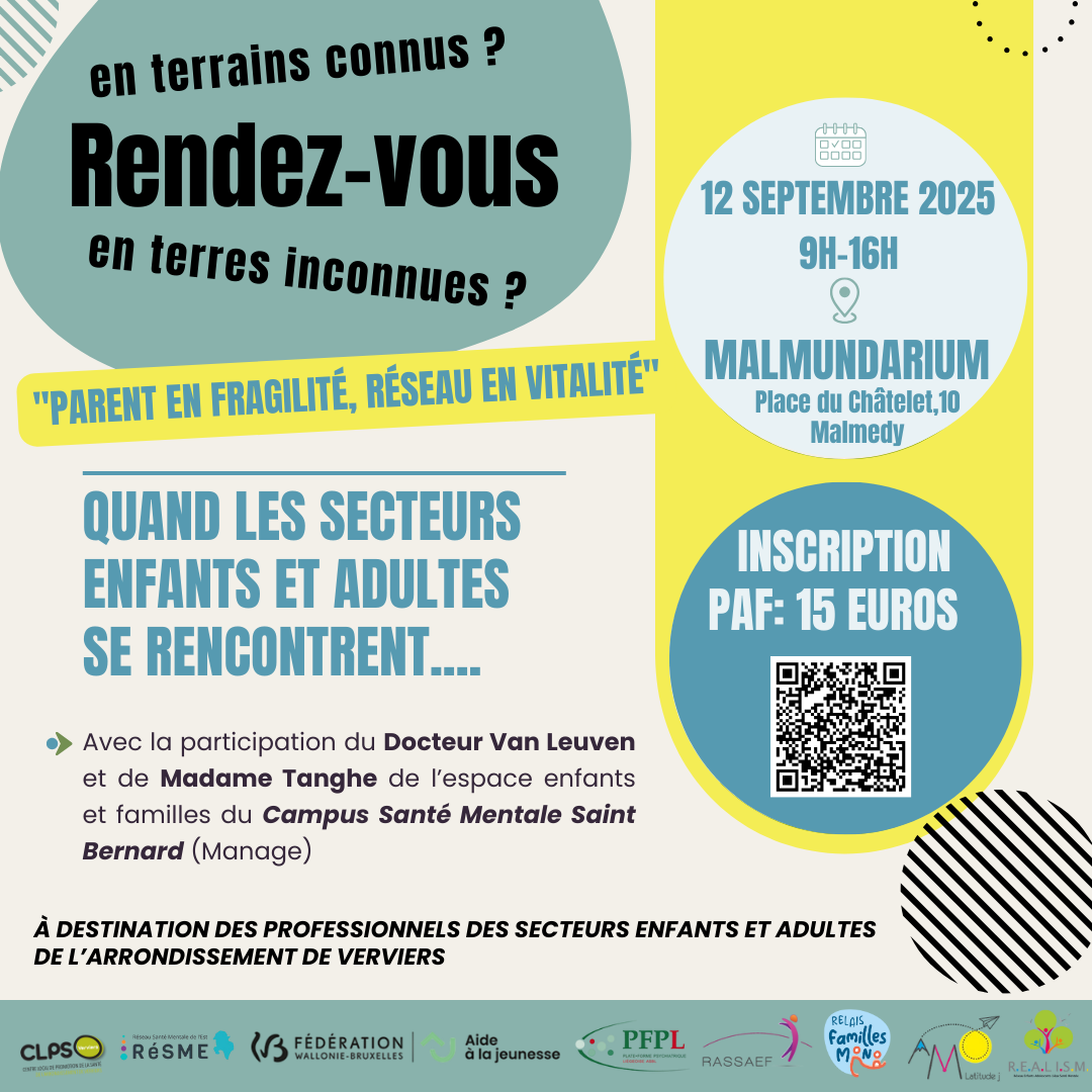 Cette journée bénéficiera de la participation du Docteur Van Leuven et de Madame Tanghe de l'espace enfants et familles du Campus Santé Mentale Saint-Bernard (Manage), et aura lieu au Malmundarium (Malmedy) entre 9h et 16h. L'inscription se fait via le QR code indiqué sur l'affiche de l'événement ci-contre.