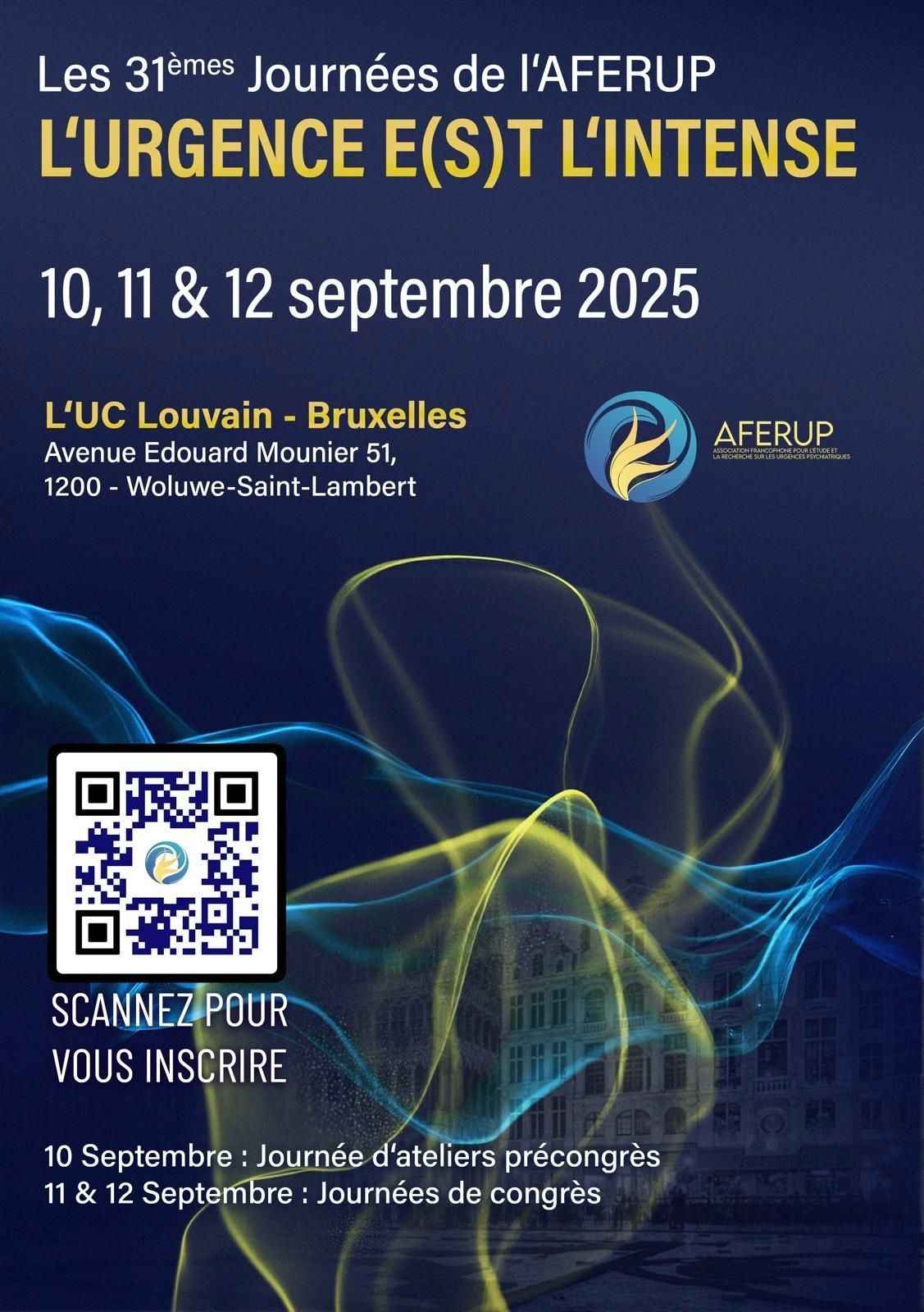 L'AFERUP, l'Association Francophone pour l'Etude et la Recherche sur les Urgences Psychiatriques, organise ses 31èmes journées les 11 & 12 septembre prochains à l'Institut Psychiatrique de l'UCLouvain sur la thématique "L'urgence e(s)t l'intense".