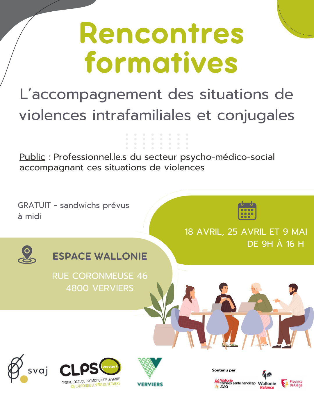 Nous vous proposons 5 journées de formation sur le sujet (9h30-16h30) organisées par le RéSME et le CLPS Verviers dans 5 villes de l'arrondissement :